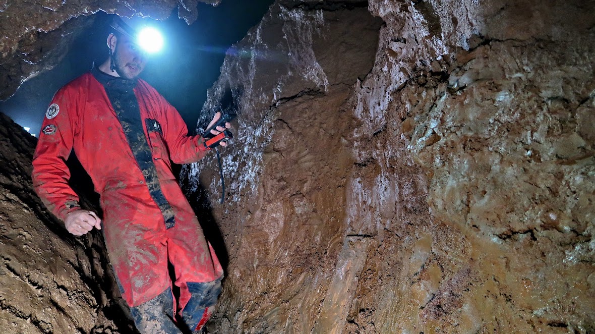 Nino zameriava jaskyňu Dustom my ju zameranú máme tiež závesným banským kompasom, len nemáme povolenie