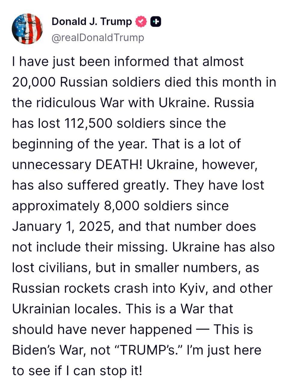 Požádal jsem ministra zahraničí Marca Rubia, ředitele CIA Johna Ratcliffa, poradce pro národní bezpečnost Michaela Waltze a velvyslance a zvláštního vyslance Steva Witkoffa, aby vedli jednání, která, jak jsem pevně přesvědčen, budou úspěšná. Miliony lidí zemřely ve válce, ke které by nedošlo, kdybych byl prezidentem, ale došlo k ní, takže musí skončit. Už by neměly být ztraceny žádné životy! Chci poděkovat prezidentu Putinovi za jeho čas a úsilí, které věnoval této výzvě, a za včerejší propuštění Marca Fogela, skvělého člověka, kterého jsem včera večer osobně přivítal v Bílém domě. Věřím, že toto úsilí povede ke zdárnému konci, doufejme, že brzy!